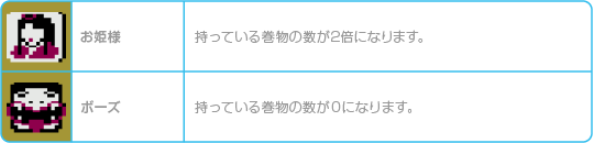 敵を倒すと巻物が出現することがあります。巻物は取ると得点が入り、持っている数に応じてシーンクリア時にボーナス得点ももらえます。なお、巻物を取った場所に「お姫様」か「ボーズ」の絵柄が出ると、持っている巻物の数が変化します。 |