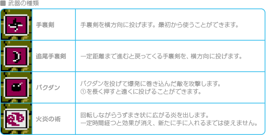 ※パワーアップキャラクターを取って火炎の術が使えるようになった場合は、効果が消えるまで武器を変更できません。