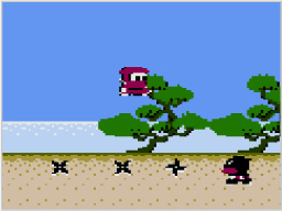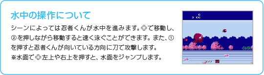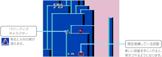 上を押すたびに使う武器を切り替えることができます。なお、「火炎の術」はボーナスステージで手に入れる以外に、シーン中にあるパワーアップキャラクターを取ることでも使えるようになります。