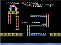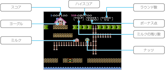 ナッツに捕まったり、水に落ちたり、ボーナス点が0になる前にヨーグルに会えないとミスになり、ミルクの残り人数が1人減ります。残り人数が0のときにミスするとゲームオーバーです。