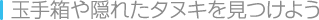 玉手箱は、特定の場所を踏んだり、刀で切ると出現します。隠れたタヌキはつねに動き回っていて、刀で切ると姿を現します。どちらも貴重な術を手に入れることができるので、いろいろな場所で |