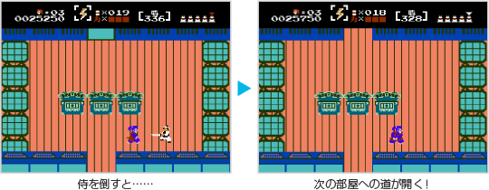 城内で先に進めなくなったときは、画面内の敵を倒してみましょう。 特定の敵を倒したり、すべての敵を倒すことで、次の部屋に進めることがあります。 ![]() |