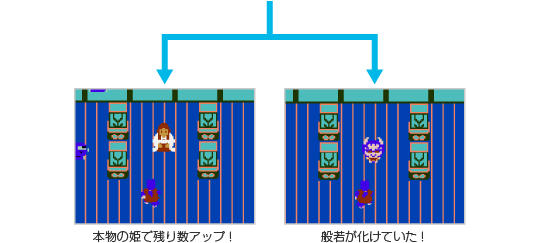 城内のどこかに、姫が捕まっています。姫を見つけると残り数が増えるので、城内を隅々まで探してみましょう。ただし、姫に化けている般若もいるので、注意してください。 ![]() ![]() |