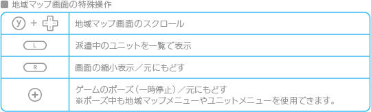 全体マップ画面で進軍する地域を選ぶと、地域マップ画面に移ります。地域マップメニューやユニットメニューを使い、ユニットを派遣したり移動させましょう。 ![]() ![]() |