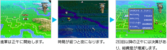 時間は自動的に進み、毎日正午になると決算を行います。決算では、それまでに解放した都市からお金をもらい、派遣中のユニットの派遣費用を支払います。地域の解放(クリア)に日数をかけすぎると、決算時にカオスフレームが減るので注意しましょう。 ![]() |