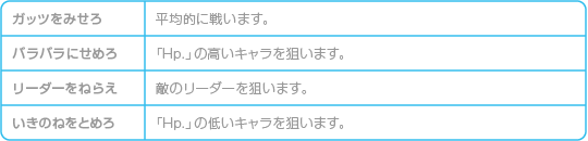 戦闘は選んだ作戦に応じ、各キャラクターが自動的に行動して進みます。全員の行動がすべて終わると戦闘終了となり、勝敗が発表されます。 ![]() |