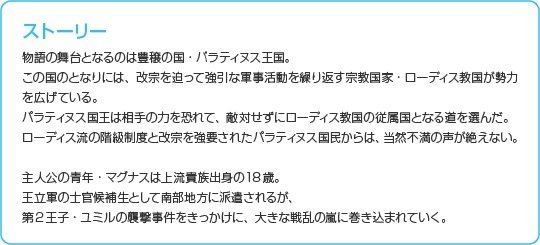 戦場では、「ユニット」という小部隊を指揮し、どのユニットがどのルートで敵軍に攻め込むかなどを指示しながら戦います。 また、物語が進むと複数のユニットをまとめた部隊「レギオン」を指揮できるようになります。レギオンの陣形には、それぞれさまざまな効果があるので、地形や戦況に応じて変えながら戦うことになります。 |