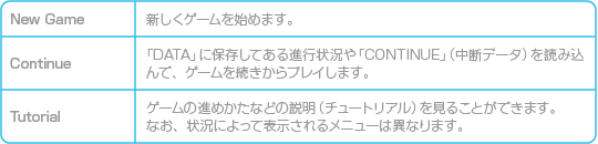 新しくゲームを始める場合は、メインメニューで「New Game」を選んでください。