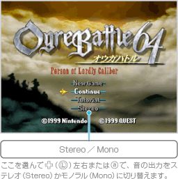 Wii本体の電源を入れたら、Wiiメニュー画面で『オウガバトル64』のチャンネルを選んでください。デモが流れ、タイトル画面が表示されます。デモが流れているときかタイトル画面で