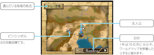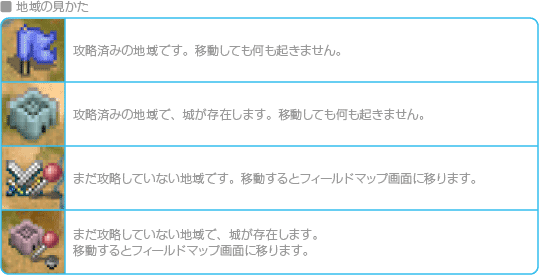 ワールドマップからは、さまざまな地域へ移動したり、ワールドマップコマンドを開いて部隊を編成したりすることができます。移動するときは、 ![]() ![]() ![]() |