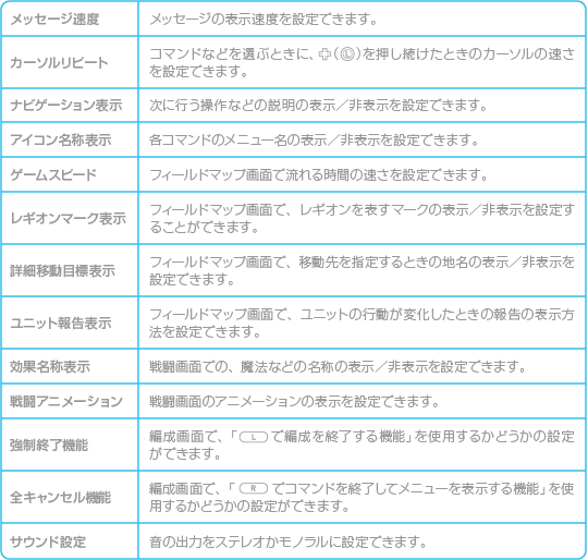 ゲームの設定を行うことができます。項目にカーソルを合わせて、 |