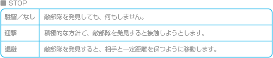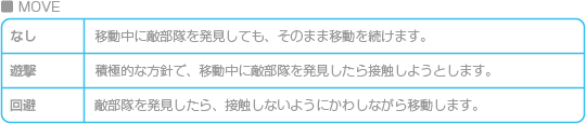 部隊コマンドの「行動」で「行動オプション」を選ぶと、フィールドマップでユニットが行動するときの方針を設定できます。行動方針は「MOVE(移動中)」と「STOP(待機中)」の2種類があります。それぞれ以下の項目から |