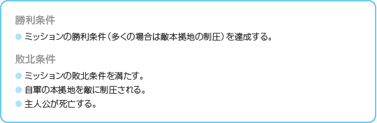 フィールドマップでは「敵本拠地の制圧」などの「ミッション」が与えられ、自軍の部隊を指揮して、ミッションの勝利条件達成をめざすことになります。 フィールドマップではリアルタイムで時間が進み、両軍の各部隊が自動的に行動します。状況にあわせ、部隊コマンドで各部隊に命令を出しながら作戦を進めてください。フィールドマップ上にあるさまざまな「拠点」を解放していくことも、勝利のためには重要です。 ※クリアしたフィールドマップを訪れた場合、ミッションはありません。 |