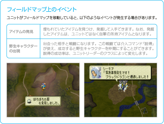 フィールドマップ上には両軍の「本拠地」があり、敵軍の本拠地には敵のボスユニットが駐留しています。 ミッション開始時は、自軍の全部隊が本拠地にいる(フィールドマップ上に出撃していない)状態となっています。ミッションが始まったら、まずはメインコマンドの「派遣」を選んで、フィールドマップに出撃させる部隊を選んでください。なお、フィールドマップ上には最大10ユニットを派遣できます。 ※部隊を選ぶときに |