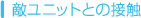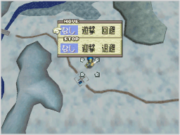 敵ユニットと接触すると、ユニット同士の戦闘になります。このとき、お互いが接触した方向によって、戦闘画面での両ユニットの位置関係が決まります。 |