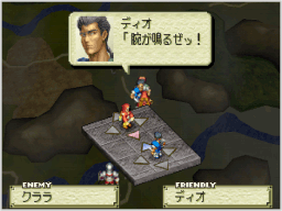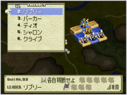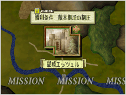 勝利条件か敗北条件を満たすと、その時点でミッション終了となります。 ミッションに勝利した場合は軍資金やアイテムを入手し、ソルジャーストックが増えます。このとき入手できるものの量は、ミッション中に統治下に置いた拠点の数や人口によって変化します。また、各キャラクターのHPが回復し、「STONE」(石化)状態も回復します。 また、ミッションに敗北した場合は、ゲームオーバーとなってタイトル画面に戻ります。 |