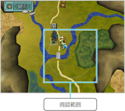 自軍の各部隊には視認範囲があり、敵部隊はこの範囲内にいないと表示されません。視認範囲は、キャラクターの移動先を選ぶときに表示される円です。 |