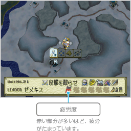 部隊は移動していると、疲労がたまっていきます。疲労度が高いと、戦闘で能力が下がるので注意してください。疲労度は拠点にしばらくとどまるか、キャンプをすると回復します。 また、疲労度が一定に達すると、部隊は強制的にキャンプを行います。キャンプ中に敵に接触すると、戦闘時にほとんどのキャラクターが「SLEEP」(眠り)状態になるので注意してください。 |