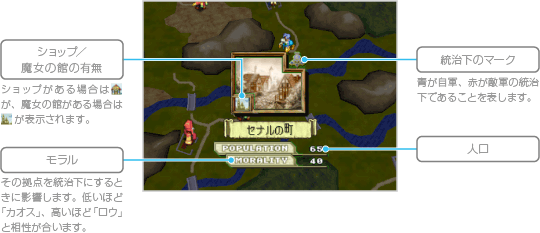 拠点はフィールドマップのさまざまな場所にあり、青は自軍統治下、赤は敵軍統治下、黄色はどちらの統治下でもない中立拠点です。拠点の情報を確認したいときは、その拠点を選ぶか、拠点・コマンドの「拠点情報」を選んでください。 統治下の拠点では、とどまってユニットのHPを回復させたり、ショップを利用したりするなど、さまざまなことができます。 ![]() |