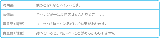 アイテムは、大きく分けて「消耗品」「装備品」「貴重品」の3つです。 貴重品はショップなどでは買うことはできず、滅多に手に入れることはできません。 ![]() |