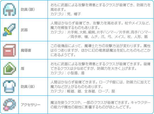 装備品は大きく分けて以下の6種類があります。「魔導書」「アクセサリー」以外はいくつかのカテゴリに分かれ、クラスによって装備できるカテゴリは異なります。装備品のほとんどは攻撃力や防御力を高めるものですが、なかには装備したキャラクターの能力が変化するものもあります。 ![]() |