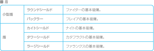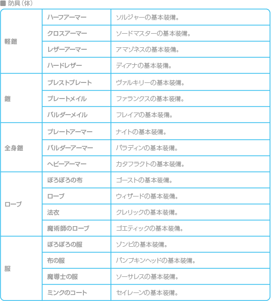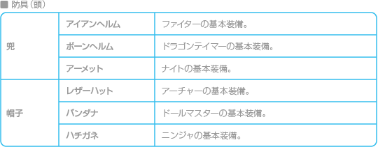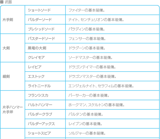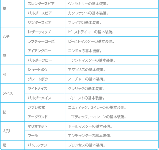 基本装備は、各クラスのキャラクターがかならず装備している装備品で、クラスチェンジにも必要となります。ここではその一部を紹介します。 ![]() ![]() ![]() ![]() ![]() |