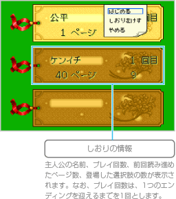 名前を登録したしおりデータを選ぶと、続きからプレイしたり、しおりデータを消すことができます。「はじめる」か「しおりをけす」を選んでください。「やめる」でキャンセルできます。 |