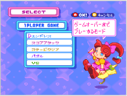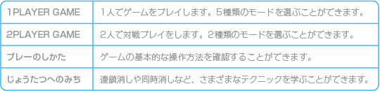 ゲームのモードを選びましょう。1人プレイでは「エンドレス」「スコアアタック」「ステージクリア」「パズル」「VS」の5つのモードを選ぶことができ、2人プレイの場合は「スコアアタック」「VS」のいずれかを選ぶことができます。 |