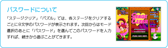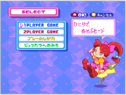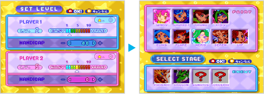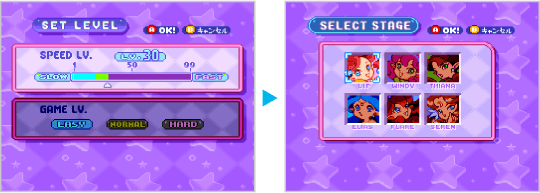 「エンドレス」「スコアアタック」「VS」では、ゲームを始める前にスピードレベル(SPEED LV.)とゲームレベル(GAME LV.)を設定します(「VS」ではゲームレベルのみ設定します)。スピードレベルはパネルがせり上がるスピード、ゲームレベルはゲーム全体の難易度です。各項目を選び、 「エンドレス」「スコアアタック」では続いてキャラクターを決めることができ、選んだキャラクターによってゲームの背景や演出が変わります。 ![]() |