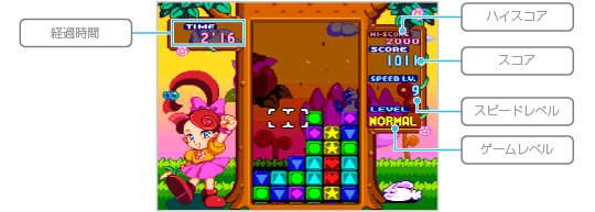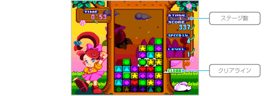 画面内に現れる「クリアライン」より上にあるパネルをすべて消して、ステージを1つずつクリアしていくモードです。ステージが進むほど、パネルがせり上がるスピードが速くなります。 ![]() |