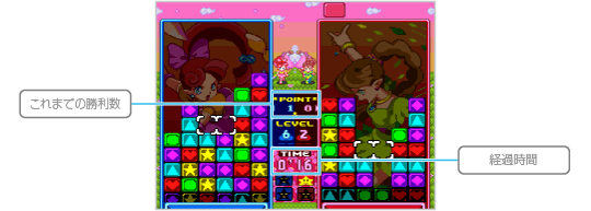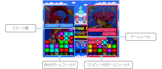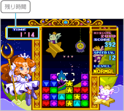 ストーリーに沿ってコンピュータと次々に対戦していくモードです。左が自分のゲームフィールド、右がコンピュータのゲームフィールドとなります。せり上がってくるパネルを次々に消して、連鎖消しなどで相手におじゃまパネルを送って攻撃しましょう。相手のパネルが天井に触れると、勝利となります。 ![]() |