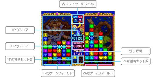 2人で「VS」をプレイする場合は左が1P、右が2Pとなります。基本的なルールは1人プレイ時と同じです。パネルを次々に消して相手におじゃまパネルを送りましょう。先にパネルが天井についたプレイヤーが負けとなり、勝ったプレイヤーは1セットを取ります。先に2セット取った方が勝利となります。 ![]() |