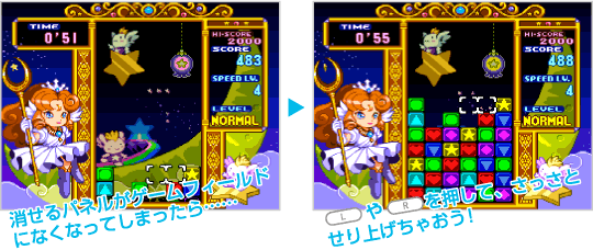 ゲームフィールド上に消せるパネルがないときに、パネルがせり上がってくるのをじっと待っていても、あまりいいことがありません。「スコアアタック」では制限時間がどんどん迫ってくるし、「VS」ではライバルがどんどんおじゃまパネルを送ってきてしまいます。こういうときは、 ただし、パネルが天井についてしまうとゲームオーバーです。上げすぎには充分注意してください。 ![]() |