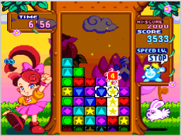 パネルをそろえると光って消えていきますが、実はこの間にも、カーソルを動かしてパネルを入れかえることができるのです。これを利用すれば、パネルが消えたあとに再びパネルが消えるような配置を作っておくことができ、うまくいけば連鎖消しを長くつなげることが可能です。 このテクニックを「アクティブ連鎖」と呼びます。操作に慣れてきたら、是非挑戦してみましょう。 |