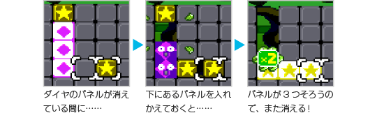 | パネルを消すと少しの間、パネルがせり上がるのが止まります。パネルが天井につきそうでピンチのときは、この止まっている時間を使って、何とかパネルの枚数を減らしましょう。なお、連鎖消しや同時消しをすると、せり上がりが止まる時間がさらに長くなります。 | ![]() |