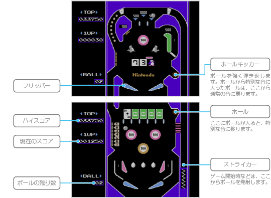 ピンボールの台は2画面分あり、上の画面でボールを落とすと、下画面に切り替わります。 |