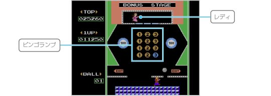 台の中央には、ビンゴランプが並んでいます。ボールがランプの上を通ると色が変わり、縦1列が同じ色になるとレディの足下の床に穴が開きます。 ![]() |