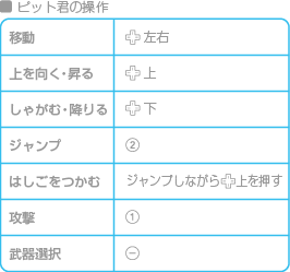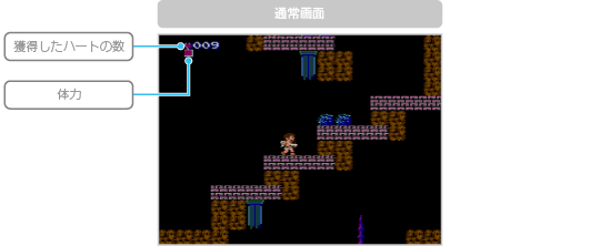 ピット君を操作して敵を倒しながら先に進んでください。敵の攻撃に当たると体力が減り、なくなるとゲームオーバーになります。また、画面外に落ちてしまった場合もゲームオーバーになるので注意してください。 |