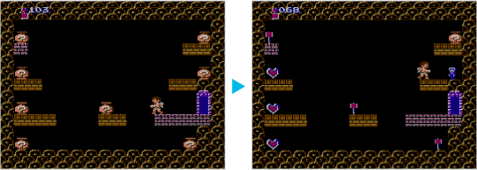 値段は高いですが、貴重なものが手に入ります。盗まれたパワーアイテムが並ぶこともあります。また、アイテムの「クレジットカード」を持っていれば、ハートが足りなくてもツケで買い物が可能です。不足分はステージでハートを手に入れると自動的に支払われ、終わるまでハートをためることができません。 |
