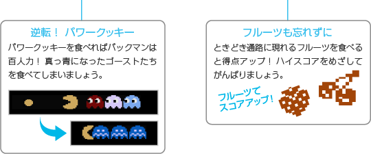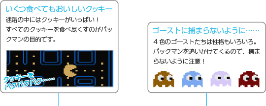 このゲームの主人公パックマンは本作でデビューし、クッキーをパクパクと食べる愛らしさで大人気になりました。その後もさまざまなゲームに登場し、最近では、ニンテンドーDS用ソフト『パックピクス』や『パックンロール』(発売元:バンダイナムコゲームス)などで健在ぶりを見せています。 |