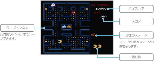パックマンを操作し、4匹のゴーストをかわしながら、迷路に並んだ黄色いクッキーをすべて食べるとステージクリアです。 ゴーストにつかまるとミスになって残り数が減り、残り数がないときにミスするとゲームオーバーです。なお、「クッキー」や「パワークッキー」、ときどき出現する「フルーツ」を食べたり、パワーアップしてゴーストをつかまえるとスコアが増えます。一定のスコアに達するとパックマンの残り数が増えます。 |