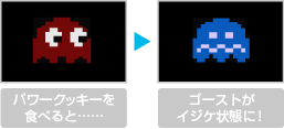| パワークッキーを食べるとパックマンがパワーアップし、一時的にゴーストがイジケ状態になります。イジケ状態のゴーストは食べることができ、連続で食べるとスコアが大きく増えます。 なお、パワーアップ中に新たに現れたゴーストは、イジケ状態ではないので注意しましょう。 |
