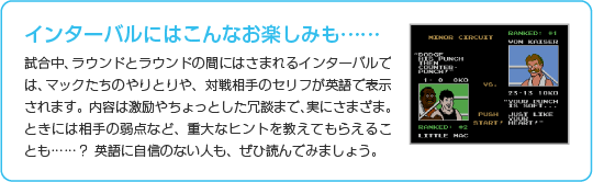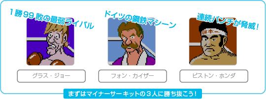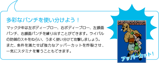 プレイヤーはマック少年を操作し、リングの中央でライバルとボクシングの勝負をします。アクションを駆使して相手のパンチをしのぎ、自分のパンチをヒットさせましょう。ルールは単純明快ですが、どの瞬間でどのアクションを行うかが、勝利の大きなカギとなります。 ![]() ![]() |