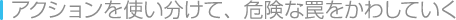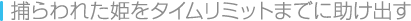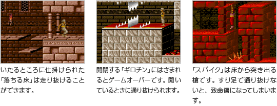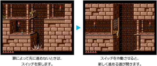 城にはさまざまな罠が潜んでおり、なかには一瞬でゲームオーバーになってしまう危険なものもあります。罠の種類に合わせて、跳び越える、走り抜けるなどのアクションを使い分けながら進んでいきます。 ![]() |