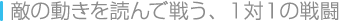 | 道中で待ち構えている敵に出会うと、剣を使った戦闘が始まります。敵が切り込んでくるタイミングを読んで防御をしたり、隙を見つけて攻撃をするなどの駆け引きをしながら戦います。 | ![]() |