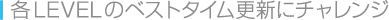 | 主人公の冒険は、LEVEL1(牢屋)から始まり、LEVEL20(最上階)まであります。各LEVELのクリア後にはベストタイムが記録されます。次にプレイするときはベストタイムの更新を目標にすることもできます。 | ![]() |