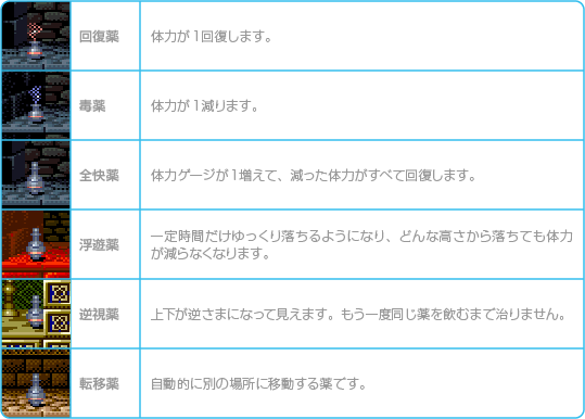 薬を飲むと体力が回復したり、特殊な効果を得られたりします。薬は道中や隠し部屋の中で見つかります。「回復薬」「毒薬」以外はすべて見た目が同じで飲んでみるまで効果がわかりません。 |