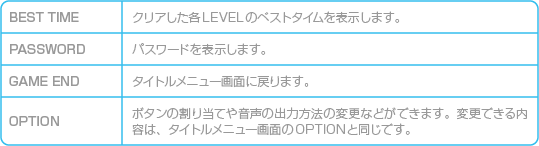 次のLEVELへの階段を登るとLEVELクリアとなります。クリアしたタイムとパスワードが表示され、次のLEVELに進みます。 |