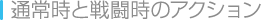 主人公のアクションは、通常時、戦闘時の2種類にわけられます。敵がいないときは探索をする通常時のアクションに、敵に出会うと戦闘時のアクションに切り替わります。 |
