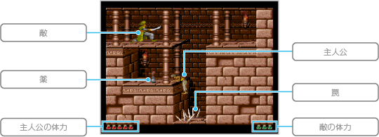 主人公は、敵からの攻撃を受けたり高い場所から落下するとダメージを受けます。ダメージを受けると体力が1減ります。道中に落ちている薬を使うか、LEVELをクリアすると体力が回復します。 |